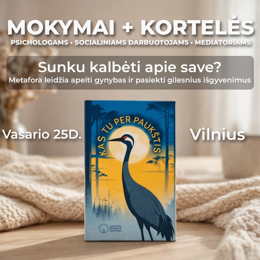 Metaforinės kortelės „Kas tu per paukštis?“ – tai projekcinė priemonė, skirta darbui su vaikais, paaugliais ir suaugusiais, taikoma tiek individualiose konsultacijose, tiek grupiniame darbe. Kortelės padeda per simbolius ir vaizdinius tyrinėti emocijas, vidinius resursus, tapatumo temas, santykių modelius, stiprybes ir iššūkius.